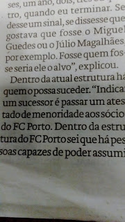 Pior no FC Porto: começou a confundir o Conselho de Administração da SAD com a Direcção do clube. Depois criou a figura do CEO. Sempre as mesmas pessoas, nenhuma profissional em Gestão, amigos de todas as horas mas sem estudos, sem preparação, sem capacidade de gestão que, de resto, nem o presidente tem. Este é o drama e a RAZÃO do fracasso, agravado com a percepção franca de, afinal, ali não se perceber tanto de futebol como era admitido, divulgado, insensato. Nenhuns princípios e práticas adoptados a não ser adequar contabilidade e balanços, únicas coisas sujeitas a auditoria e obrigação ainda que mínima, de informação pública. E quem tem deixado a SAD? Os responsáveis pelas finanças, Fernando Gomes e, duas vezes, Angelino Ferreira (uma para acompanhar o novo estádio)... Por sinal, saídas com acrimonia, como ainda agora se viu com este, prosseguindo uma guerra latente com o primeiro - os tais Estados de alma e questões pessoais que o ex-dirigente Nuno Antas de Campos notou em O Jogo.
