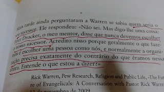 "Vou ser franco: não acredito em líderes. Toda a conversa acerca dos líderes é um absurdo perigoso. É uma desculpa para não agir. Sinto-me muito infeliz por termos tido no séc XX como líderes Hitler, Estaline e Mao... Temos de ter muito medo dos líderes. Têm carisma? Também tivemos demasiado carisma nos últimos cem anos. Truman foi o melhor presidente dos EUA e o que mais alcançou. E não tinha perfil de líder. Todos o subestimavam, incluindo ele próprio (...) os verdadeiros valores dos líderes são avaliados por quem é promovido, quem é demitido, quem é recompensado e quem é punido. As decisões relativas à pessoas são altamente visíveis. As pessoas numa organização não são abstracções, são reais. (...) É fácil fazer boa figura numa época de expansão... Mas também todas as épocas de expansão - e eu já vivi umas quatro ou cinco - põem os charlatães no topo. (...) Há incentivos à má gestão (...) empresas são sistematicamente saqueada, acontece depois de todas as épocas de grande crescimento" - eis um resumo de liderança, para quem tanto viveu a estudar empresas e organizações.